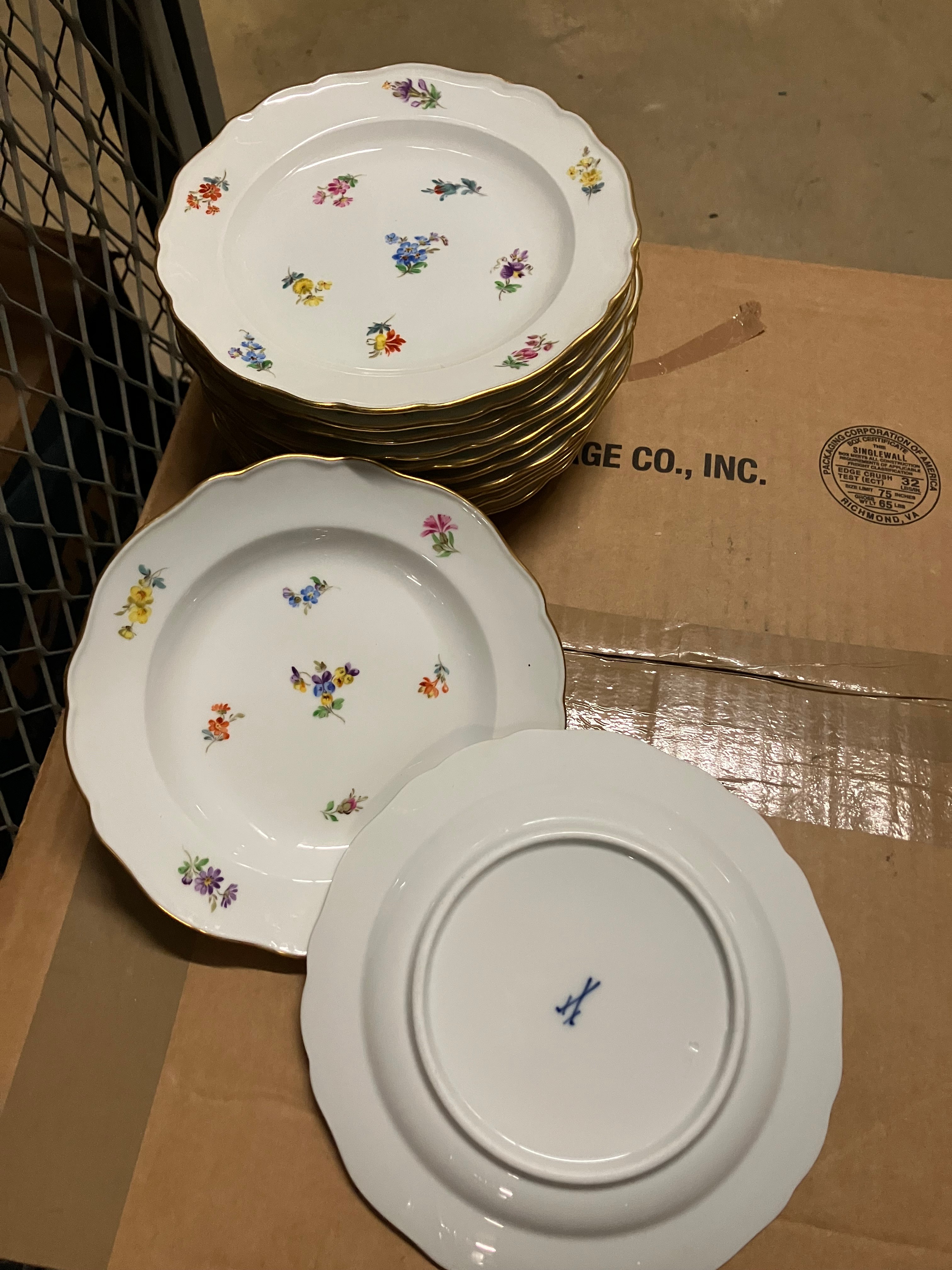 Meissen Hand Painted Scattered Flowers Dinner Plates - Blue Crossed Swords Mark - Antique German Porcelain...